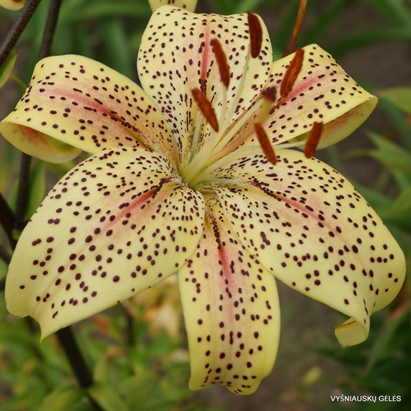 vyrovnané, plochejšie kvety sú svetlo žlté, celé posiate veľkými tmavými škvrnami, v dlhých pyramidálnych súkvetoch treba aj s 20 pukmi. Stredom okvetných lístkov sa tiahne purpurovo fialový pruh v červánkovom opare, celkový dojem umocňuje aj pekne vyfarbený červený peľ na dlhých nitkách. Ľalia je vyššia ako väčšina ostatných ázijských. Výška 130 cm, ale pri dobrých podmienkach aj 160 cm. Má v rodokmeni sibírsku ľaliu Lilium dauricum, ktorá ako jediná rastie za Severným polárnym kruhom, kde ranne nielen vykvitá a dokonca dozreje aj v semeno.